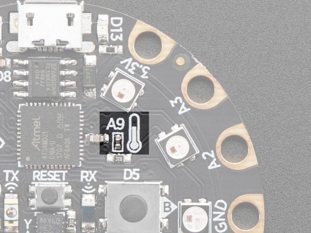 Click SAVE and run the code, and your Serial output will change. Put your finger on top of the thermometer on the board – it’s in the upper right quadrant – to see a temp change (image credit Adafruit):