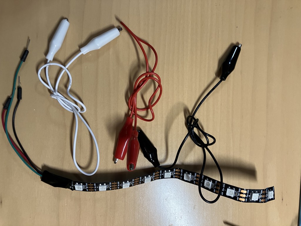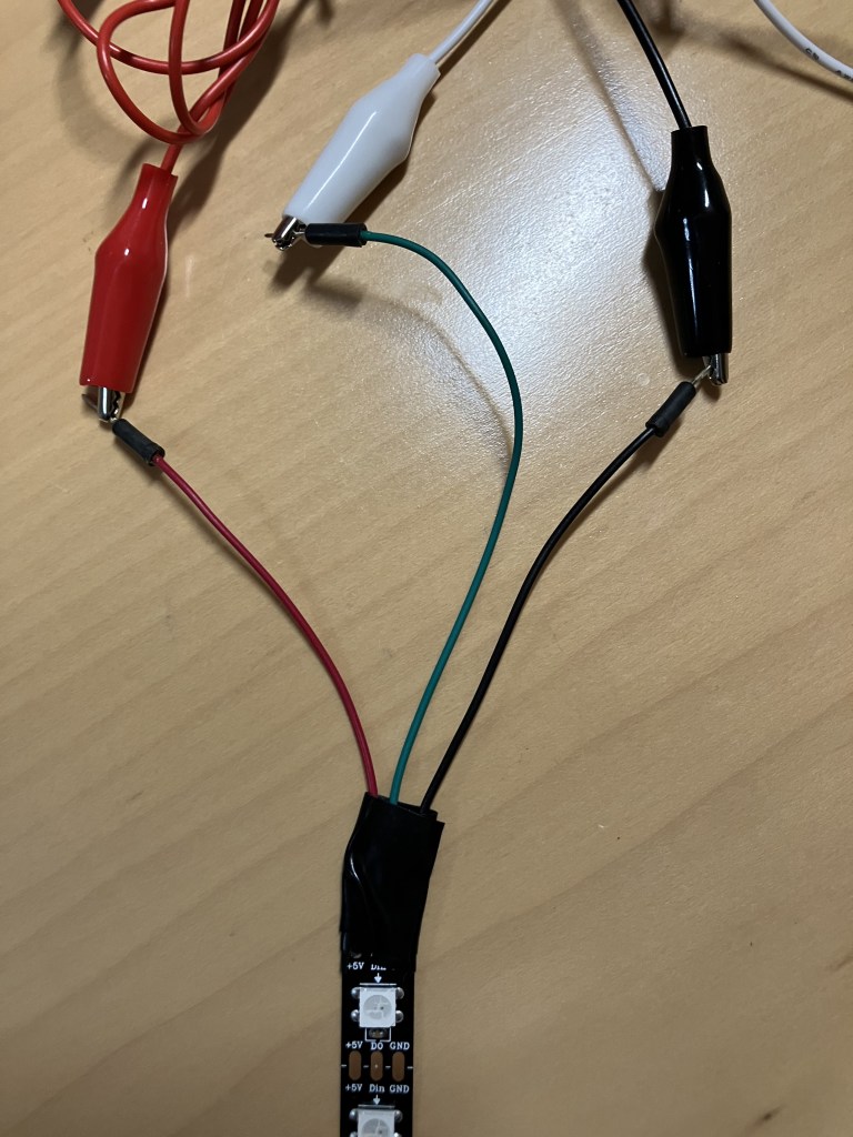 Your three alligator clips (you can use any color but to make things easier I’d recommend these three) and the strip of LEDs with trailing jumper wires. The LED strip has three outputs, the same as the original one we used with the GEMMA: Power (+5v), GND (-), and data (the down arrow). I’ve soldered jumper wires on to these to make your life easier- they should be red/black/another color to correspond to power/ground/data, but double check, then clip on the alligator clips (I’m once again using red for power, black for ground, and white for data)