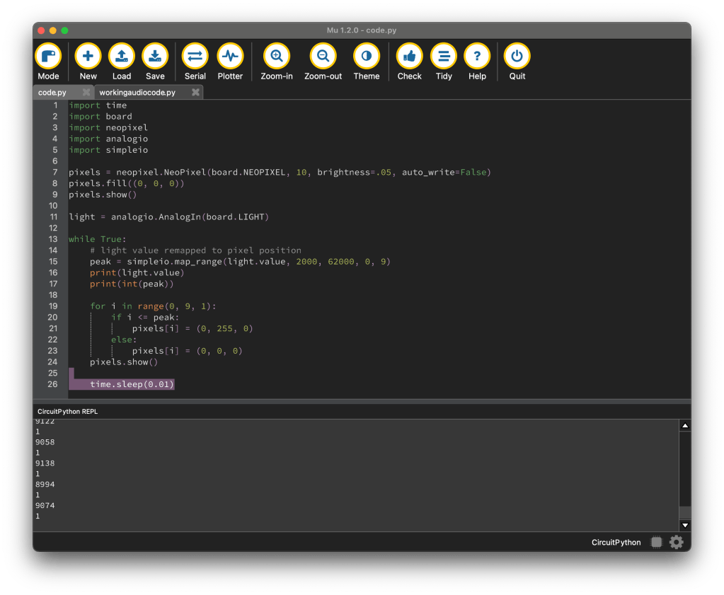 It’s got two alternating values- the raw light value, which is a large number, and the peak, which is the value it’s using to determine what Neopixel to turn on. Put a bright light near the CPX and you’ll see the peak number go up.