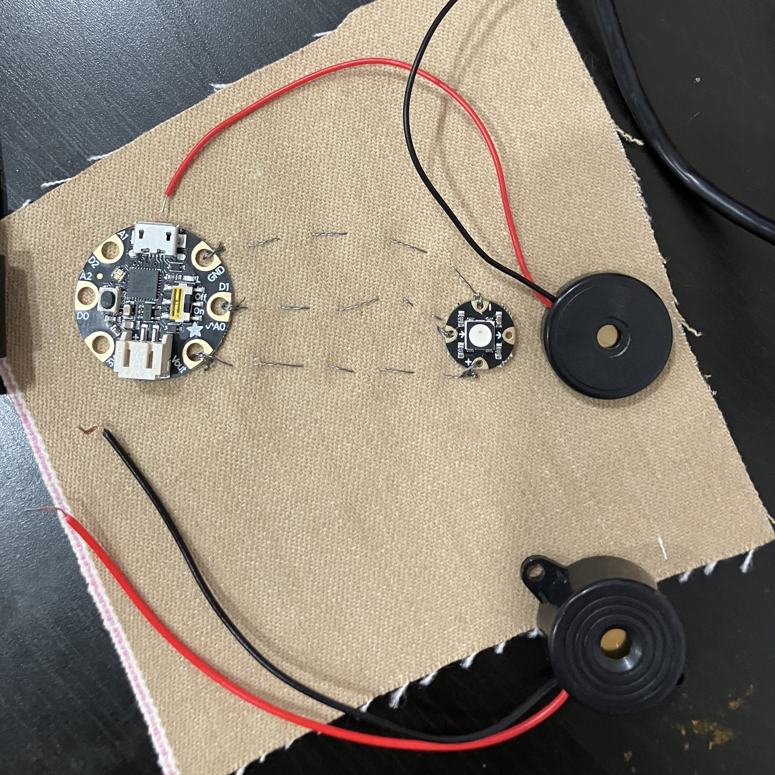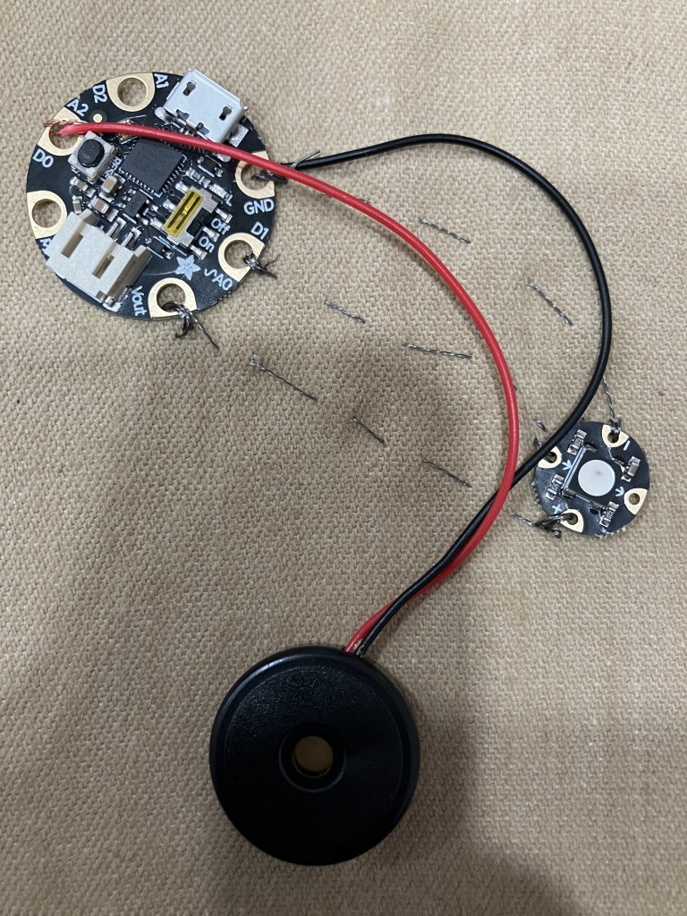 Grab your sewed circut, LED, and the piezo buzzer – a little black plastic disk with red and black trailing wires. Piezos contain little disks that deform in predictable ways when we apply electricity to them, so we use that knowledge to make them vibrate at frequencies that produce musical tones. There are a two different kinds of buzzers- it’s an aesthetic difference. The photo has both for reference but you’ll only have one.