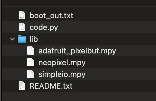 Now, we actually will rarely use the straight PWM values for a buzzer. Piezo tones are so common that CircuitPython has an even simpler library for using them- its called simpleio. But it doesn’t actually come standard on the GEMMA, so we’re going to install it ourselves. Go to the class resources folder and download the file named simpleio.mpy. You need to drag and drop that on your CIRCUITPY drive, in the lib folder. Note you’ve already got some libraries in there- that’s the neopixel libraries we used before! It will now look like this: