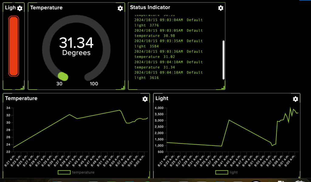 Step 4: Set up your Dashboard on Adafruit IO to have a light block, a temperature block, a Status Indicator Block, and then two line graphs- one for Light and one for Temperature. You can follow the directions on the Adafruit site if you haven’t done this yet. Your dash should look like this: