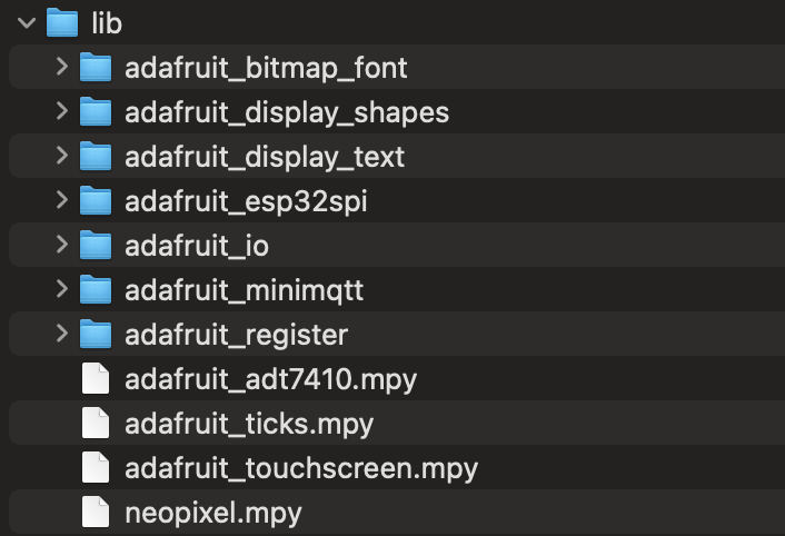 Step 2: Make sure you update the libraries on the CIRCUITPY board – download the DisplayShapesLibraries.zip file here, or you can manually libraries from wherever you downloaded your library folder until the lib folder on CIRCUITPY looks like this: