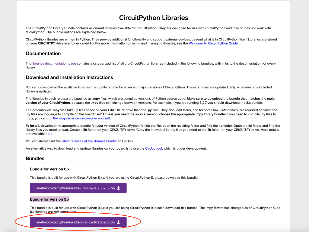 Navigate to the CircuitPython.org library page. This is a huge list of .zip files of libraries. Locate and click the button to download the one labeled Bundle for Version 9.x. As of this writing, it’s the second purple button down the page:
