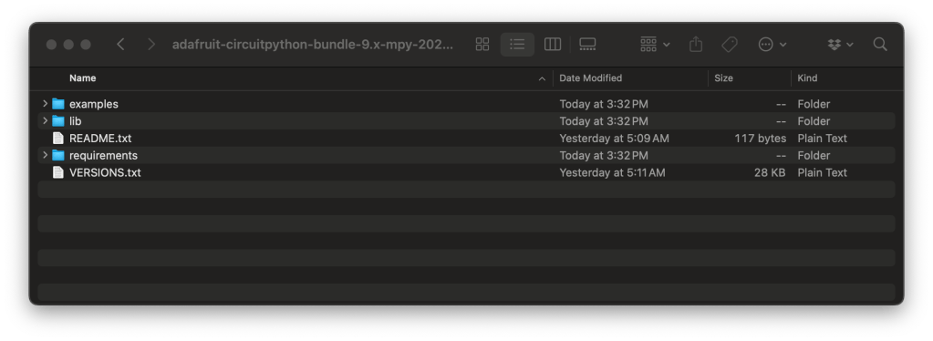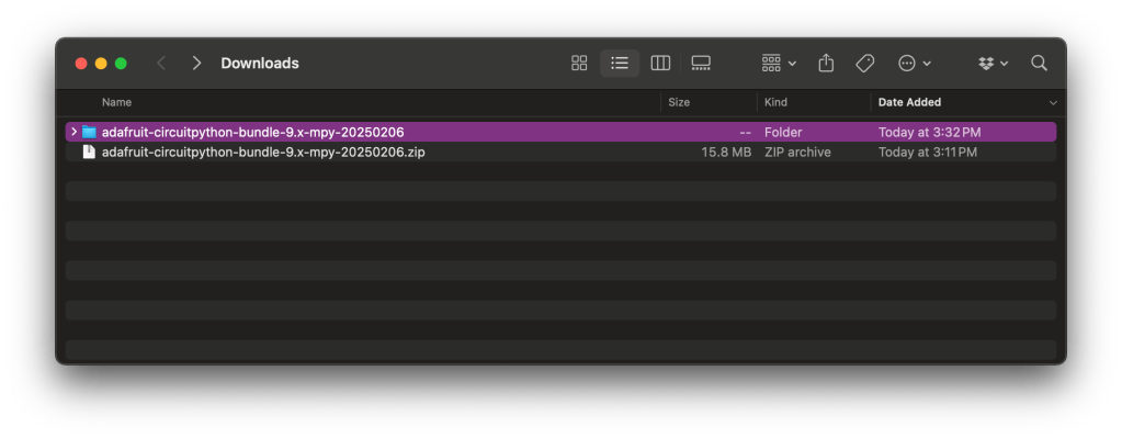 The actual file you download will have a name that starts with adafruit-circuitpython-bundle, but the information after that will be different because these libraries are updated with every new version of CircuitPython AND often rebundled every day or so. In the screenshot above, you can see that it ends with a string of numbers that tells you the date – 2025-02-06, meaning these were the libraries released as of Feb 6 2025. Your file will have a different date because you, my friend, are living in my future (cool, btw, how is it going?).