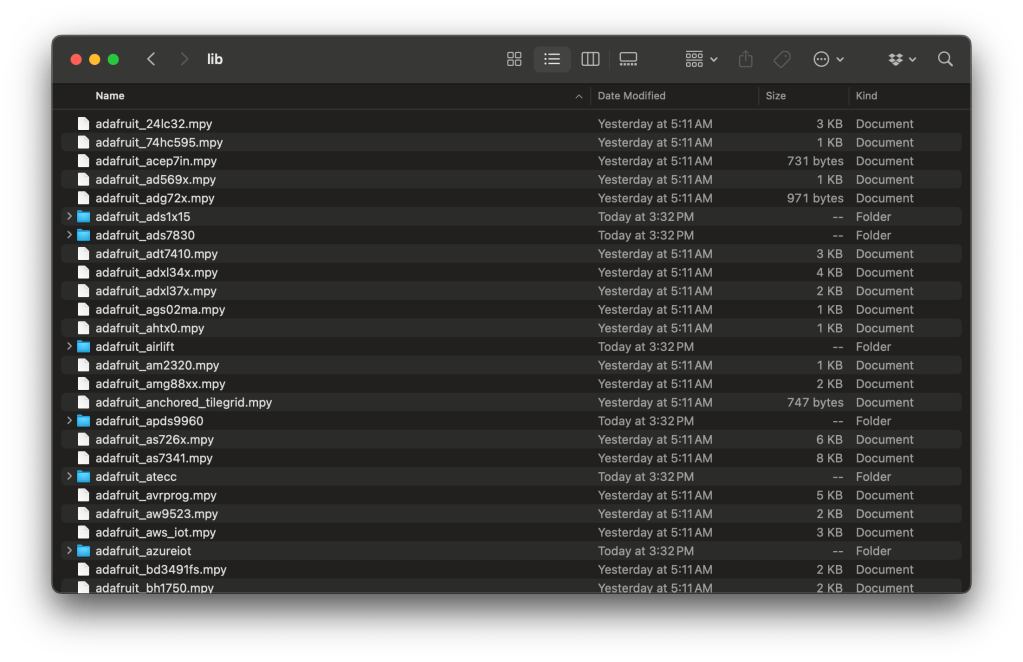 What you have here is hundreds of files and folders, almost all of which are or contain .mpy files. These are modified python files- they are compressed to take up less space because your microcontroller is a tiny little thing. But even when compressed, as a whole they take up a lot of space, so we never install all of them. We only install the bare bones of what we need.