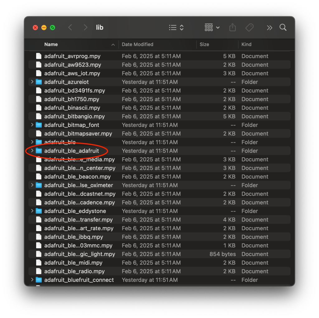 Scroll through that list of files (helps to sort it alphabetically) until you locate a folder called adafruit_ble_adafruit: