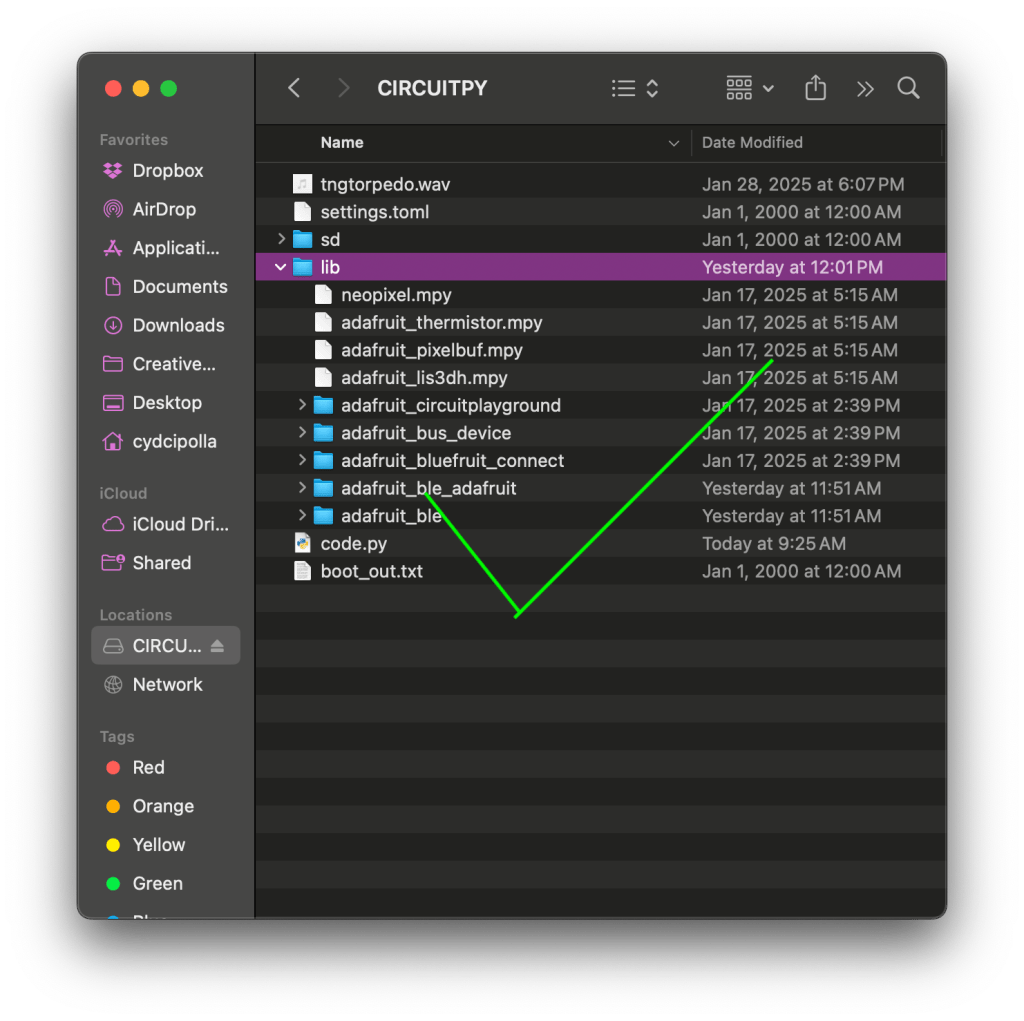 Plug in your Bluefruit, and navigate to the CIRCUITPY drive. Look inside, and in particular, at the lib folder. It likely has something like this going on: