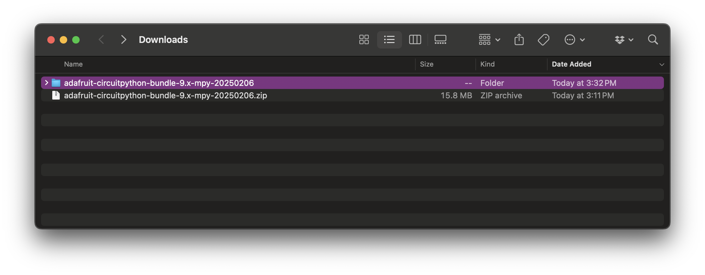 The actual file you download will have a name that starts with adafruit-circuitpython-bundle, but the information after that will be different because these libraries are updated with every new version of CircuitPython AND often rebundled every day or so. In the screenshot above, you can see that it ends with a string of numbers that tells you the date – 2025-02-06, meaning these were the libraries released as of Feb 6 2025. Your file will have a different date because you, my friend, are living in my future (cool, btw, how is it going?).