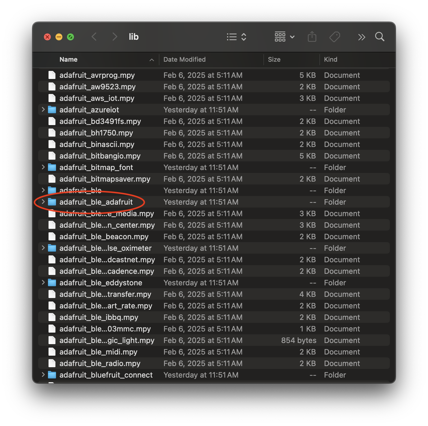 Scroll through that list of files (helps to sort it alphabetically) until you locate a folder called adafruit_ble_adafruit: