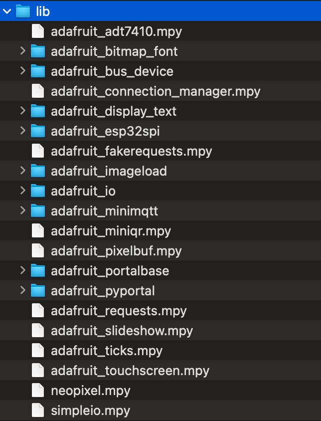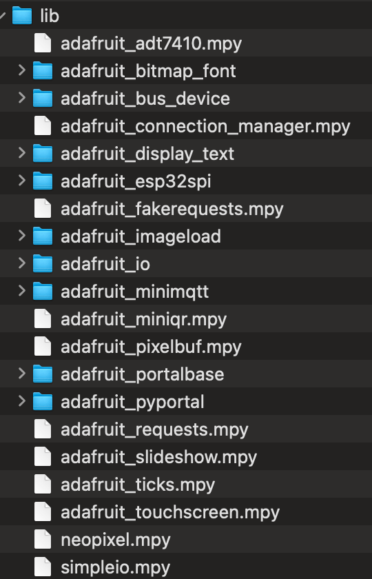 Update libraries: Make sure you update the libraries on the CIRCUITPY board – WE NEED A LOT OF THEM – download the OpenWeatherLibraries.zip file here, (or you can manually load libraries from wherever you downloaded your library folder) until the lib folder on CIRCUITPY looks like this: