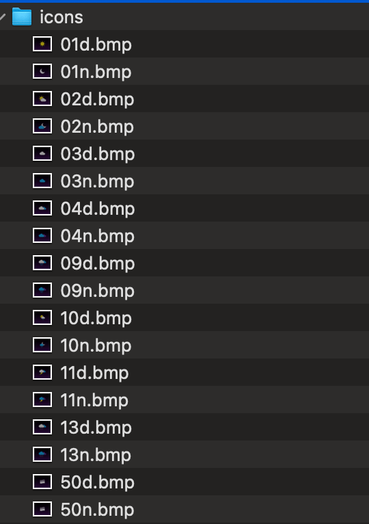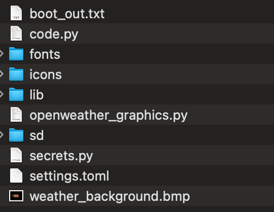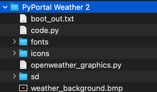This weather display uses bitmap fonts like our little data logger did, but it also uses images as well – so you’re going to need to copy a bunch of stuff onto your little drive. Go back to our shared class folder and grab PyPortal Weather files.zip. Download it and unpack it – it’s going to give you all of the “extra” stuff you need on your CIRCUITPY drive. It should look like this: